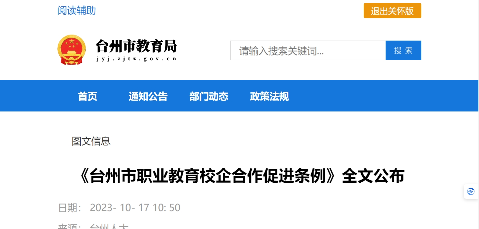日前,經(jīng)浙江省第十四屆人民代表大會(huì )常務(wù)委員會(huì )第五次會(huì )議批準,浙江臺州正式發(fā)布職業(yè)教育校企合作促進(jìn)條例共25條,定于2024年1月1日起實(shí)施。