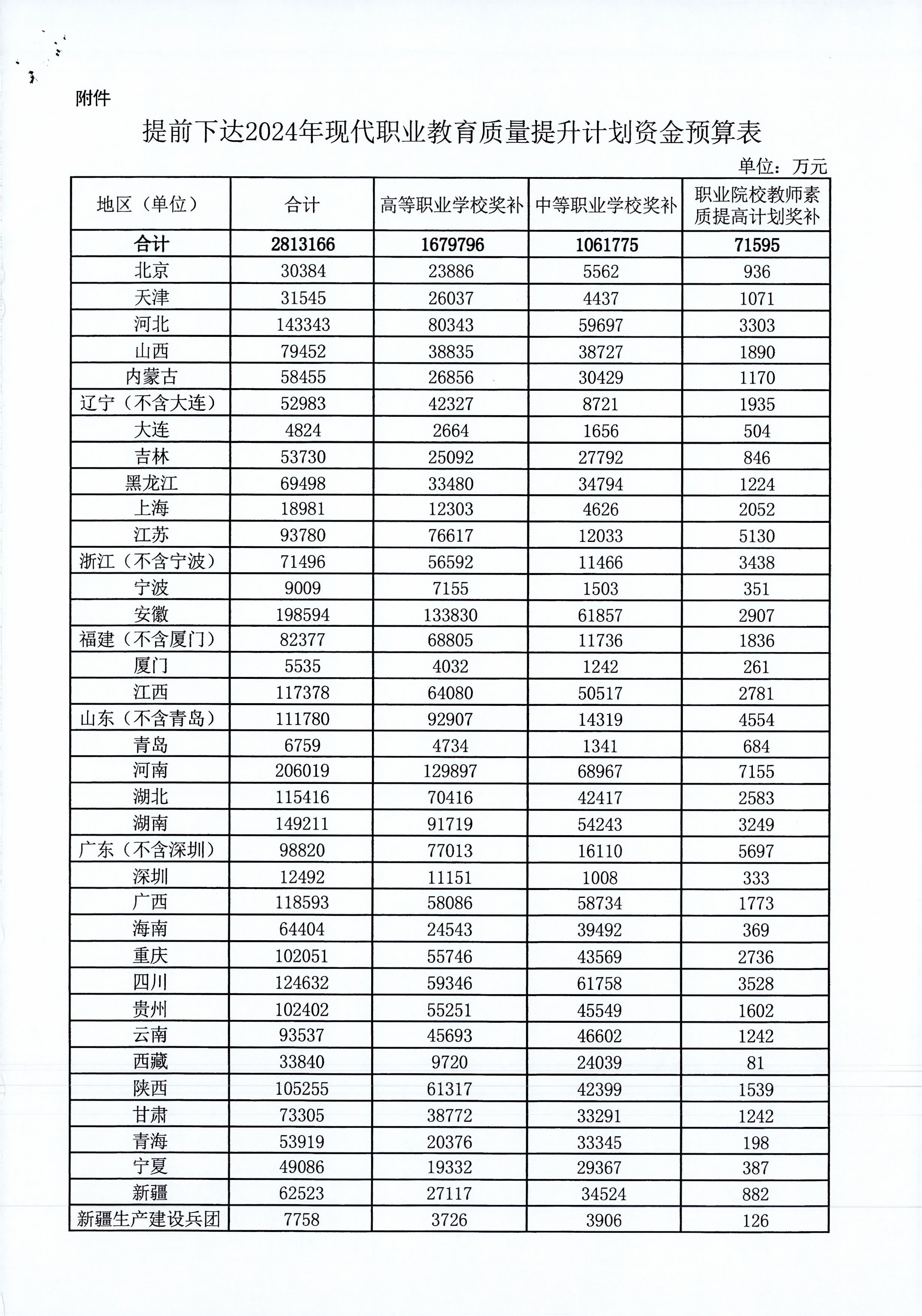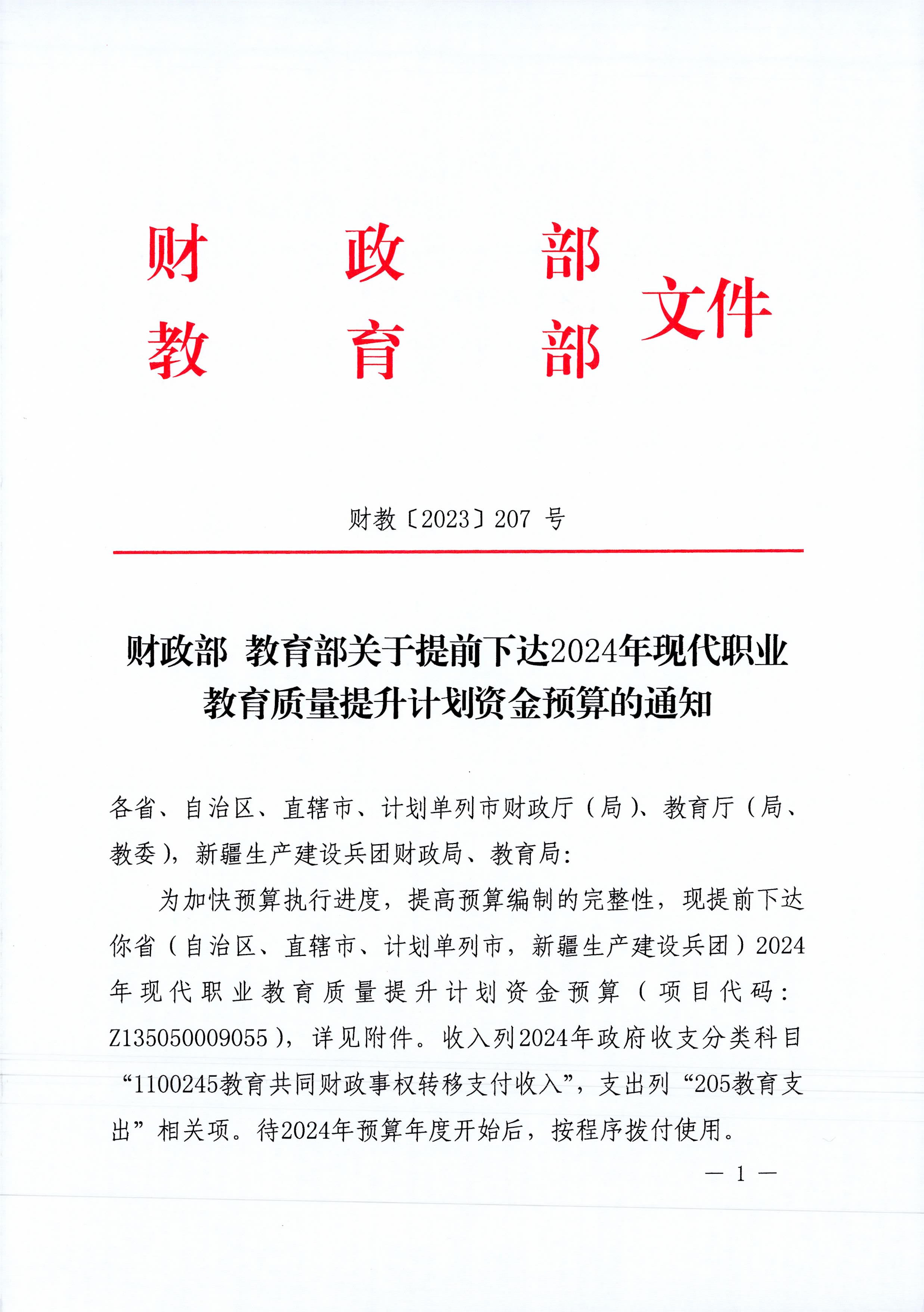 近日,財政部、教育部發(fā)布《提前下達2024年現代職業(yè)教育質(zhì)量提升計劃資金預算的通知》