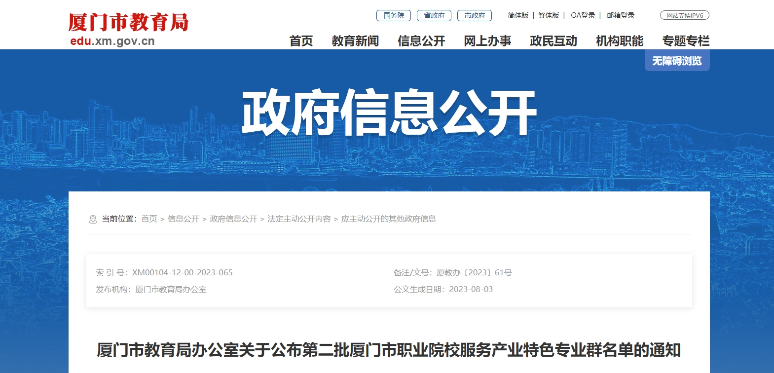 近日,廈門(mén)市教育局在其官網(wǎng)上發(fā)布《廈門(mén)市教育局辦公室關(guān)于公布廈門(mén)市應用型本科高校高水平專(zhuān)業(yè)立項建設名單的通知》,根據《廈門(mén)市教育局關(guān)于實(shí)施應用型本科高校高水平專(zhuān)業(yè)建設計劃的通知》(廈教發(fā)〔2023〕5......